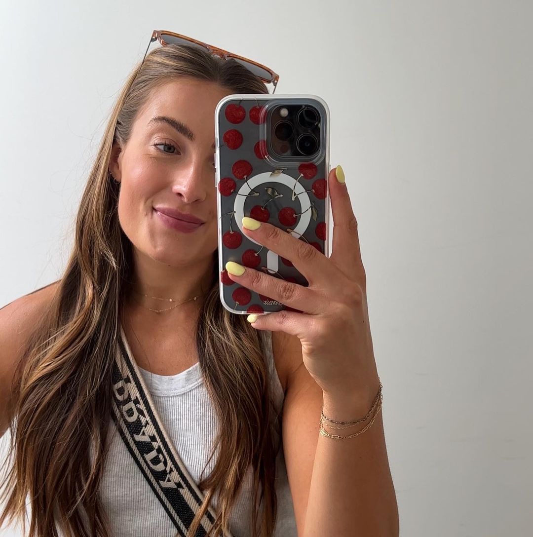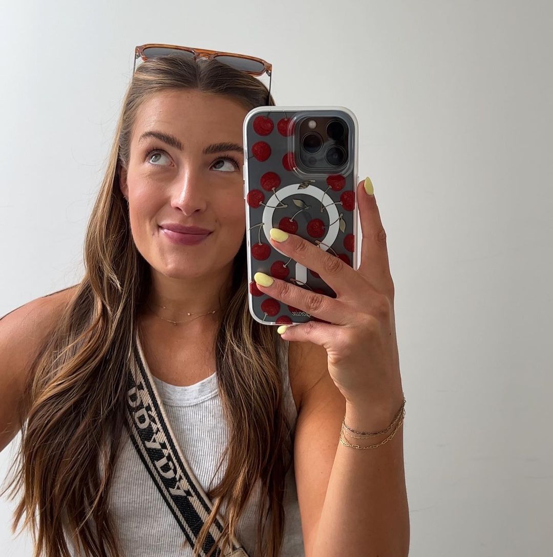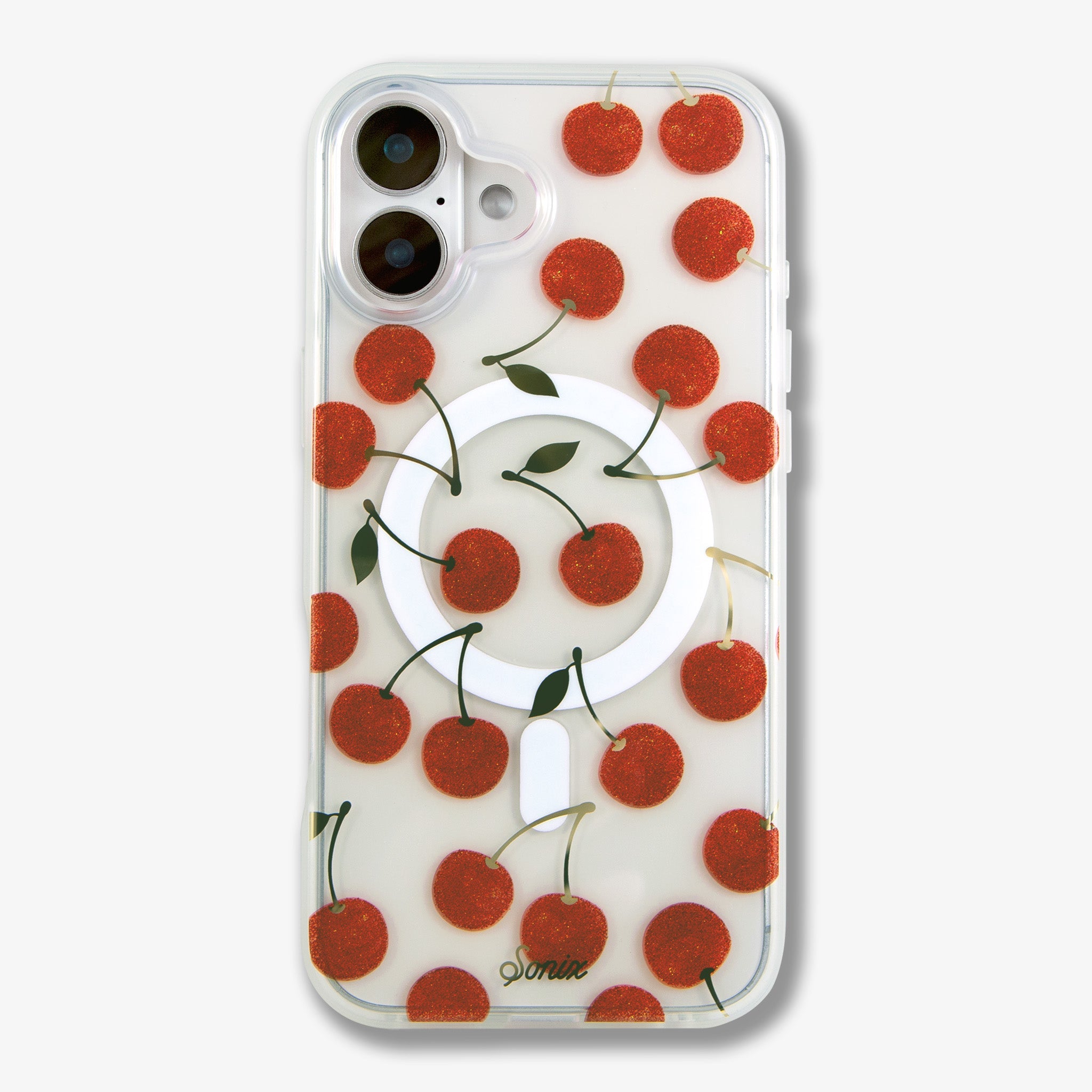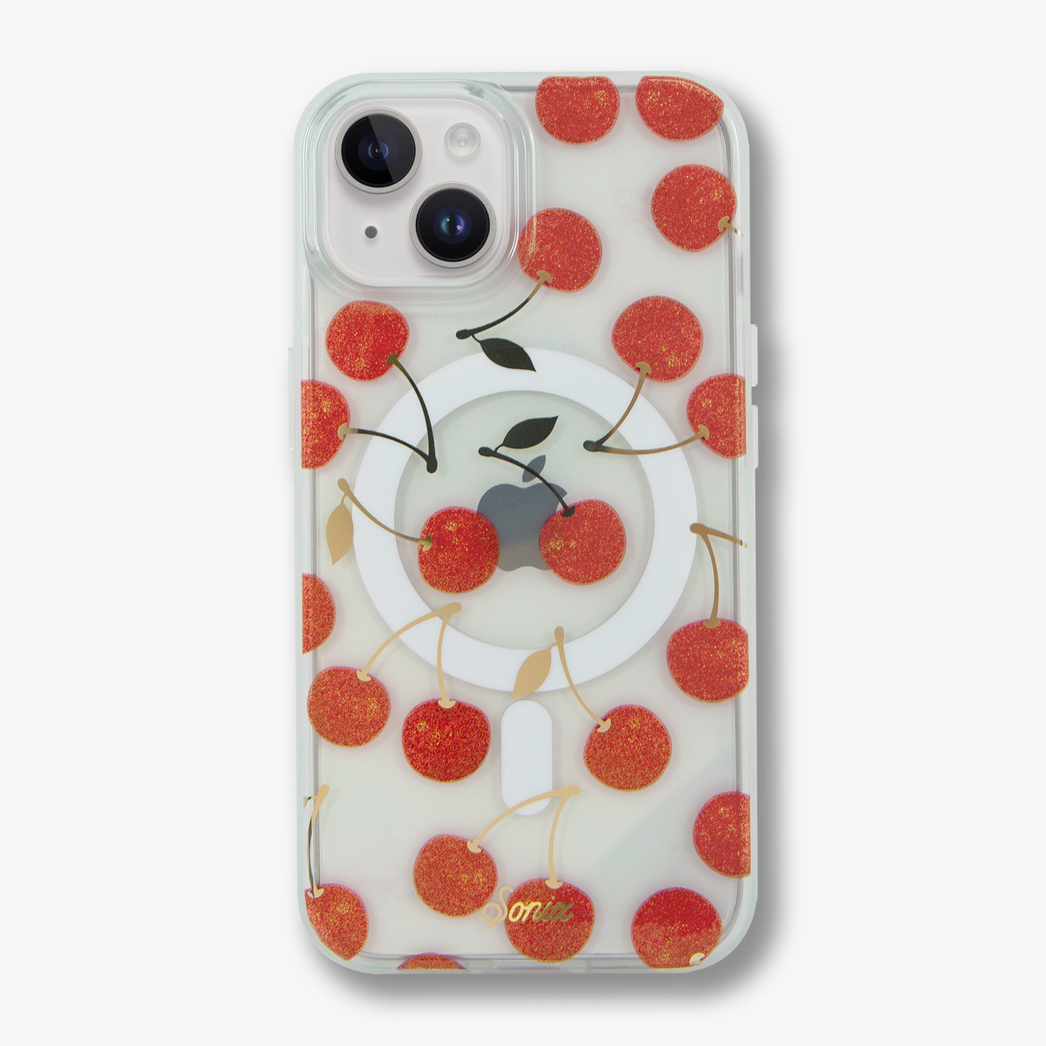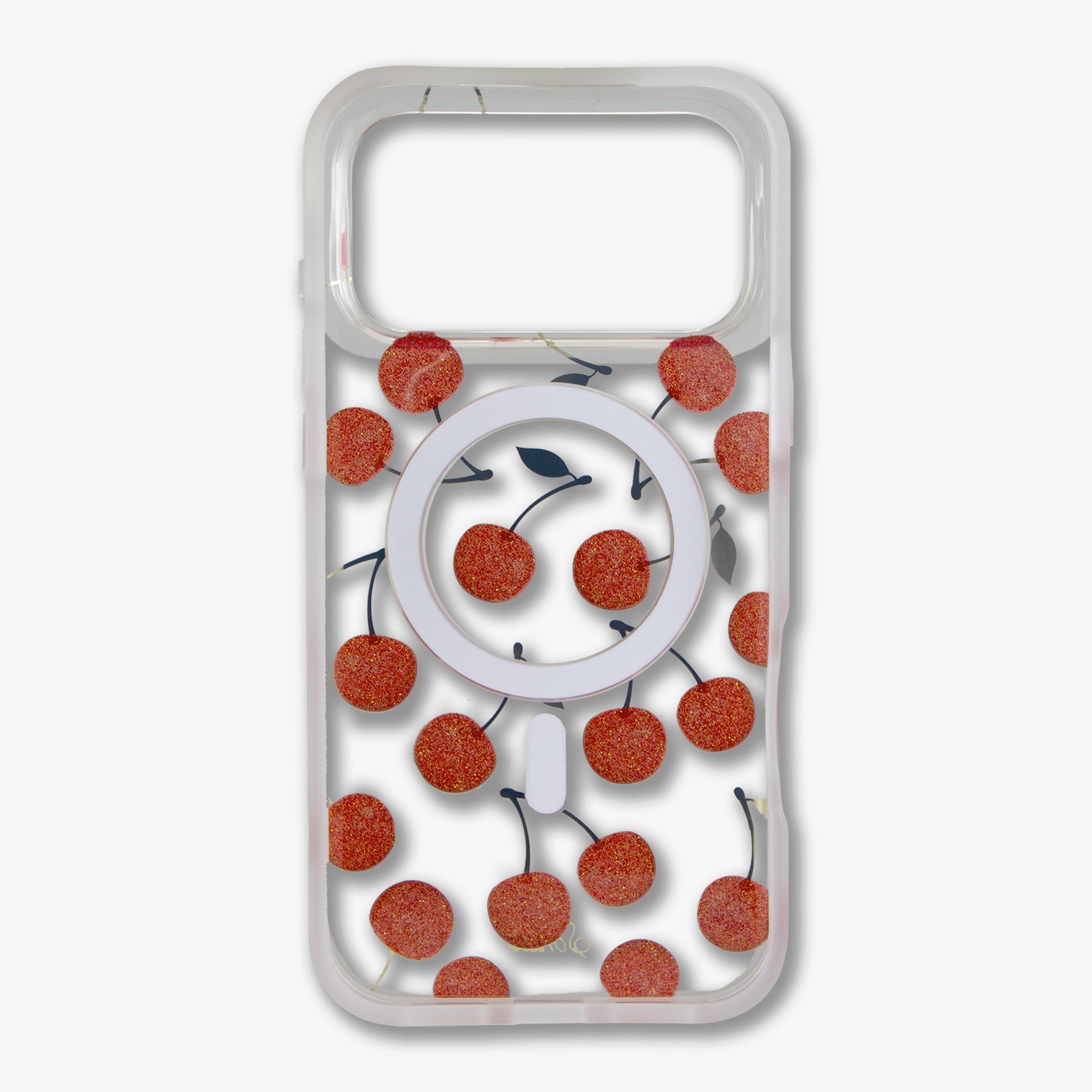 To many. the cherry is a symbol of renewal and good fortune. Sweet and naturally fashioned in a rich red hue. the cherry is soft and eye-catching with a formidably tough center. And. we take that as a sign that the feminine energy makes good fortune on its own. The deep. red cherries of this MagSafe® compatible iPhone case flourish across a clear backdrop. allowing your phone’s color to dictate the landscape. Beautiful stems and leaves fashioned from our signature gold foil add to the element of prosperity you carry with you.